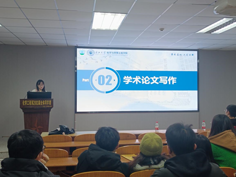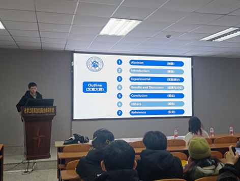 21级研究生申利伟基于自己丰富的经验,以“如何撰写学术论文”为题,介绍了学术论文的写作大纲。从论文的写作结构出发,结合实例具体分析了一篇文献的写作结构:背景现状、实验方法、实验结论、研究意义四部分,并从研究背景介绍、量化图表和结论、创新点和应用化讨论这三个方面为同学们进行了更为详细的讲解。