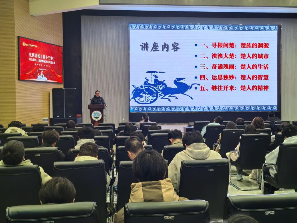 (通讯员 刘晓芳)2025年11月21日下午,bw必威西汉姆联官方网站在西校区农科大楼1058报告厅举办化雨讲坛第十三讲——“走进神秘浪漫的楚文化”专题讲座。本次讲座特邀人文与新媒体公司历史系主任、荆楚文化研究中心副主任卢川老师主讲。公司党委副书记杨会军、辅导员徐茵及2025级全体员工共同参与。