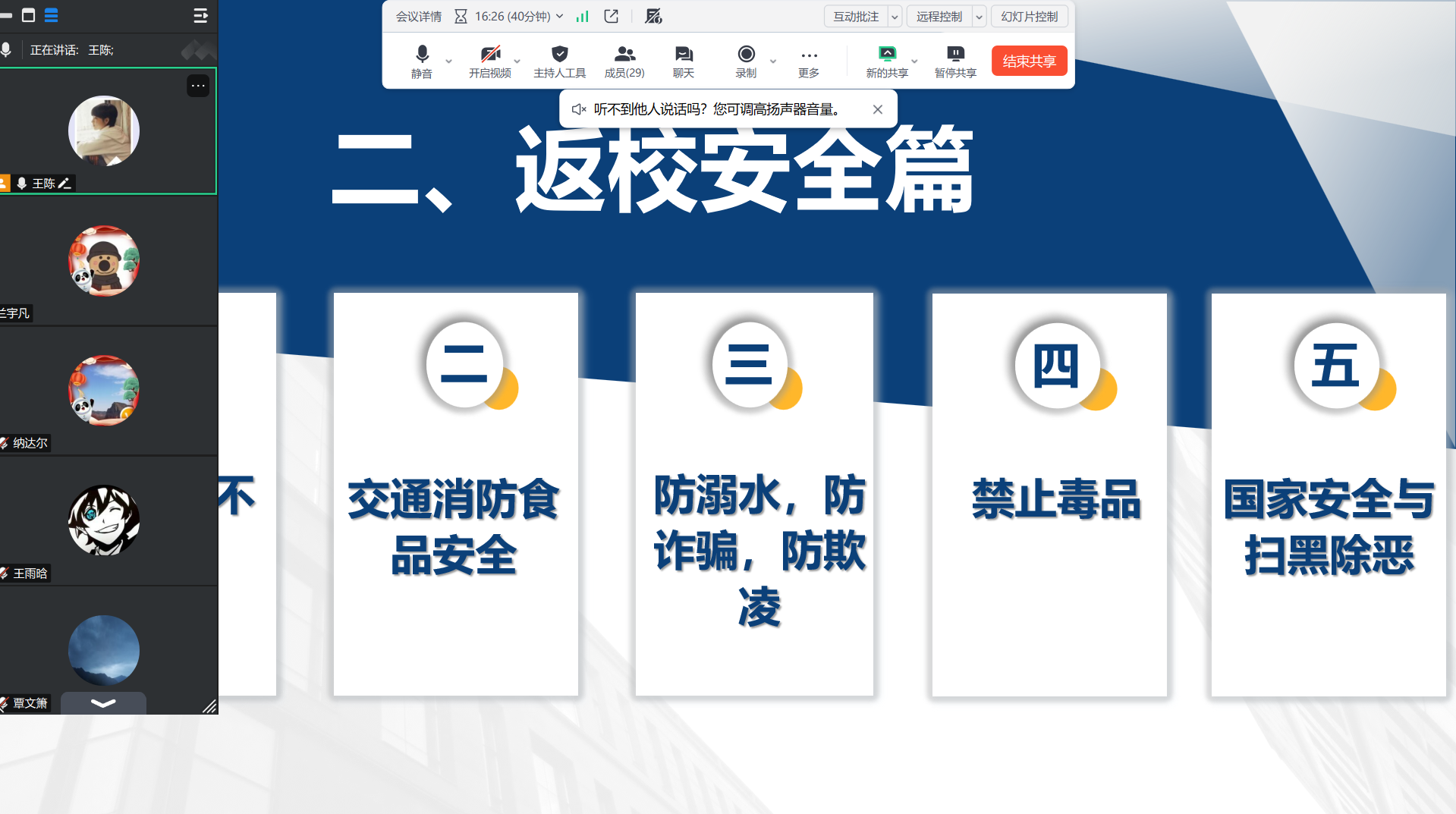 本次班会紧扣安全教育、学业指导、就业规划三大核心内容,内容充实、针对性强。在安全教育环节,各班围绕防电信诈骗、消防安全、交通安全、网络安全等重点领域,结合典型案例深入讲解,提醒员工认清各类安全风险,提高警惕性与辨别能力,自觉遵守安全规定,筑牢个人安全防护屏障,守护自身生命财产安全。