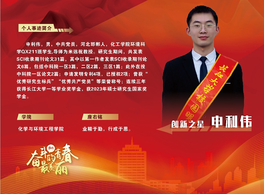 进入大学以来,申利伟始终把专业学习放在首位,他知道,只有牢固的专业知识才是今后工作的根本。在本科期间必修平均绩点4.09,名列专业第一,多次获得国家励志奖学金、三好员工等荣誉称号。在学习书本知识的同时,他还积极加入公司老师实验室,在导师和学长的帮助下开展大创项目,并获得了湖北省老员工化学化工学术报告会二等奖。大四时以专业第一保研至本校继续攻读硕士研究生,目前顺利通过了四六级考试,并连续三年获得了bw必威西汉姆联官方网站一等学业奖学金,获2023年硕士研究生国家奖学金,荣获“优秀研究生标兵”、“优秀共产党员”等称号。