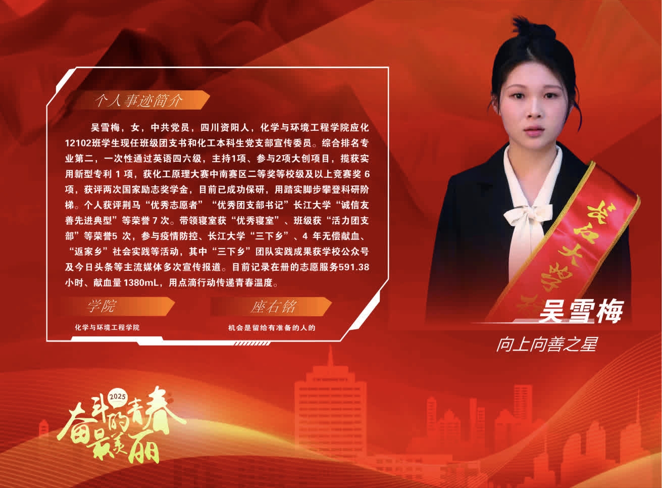 【个人简介】吴雪梅,女,汉族,中共党员,四川资阳人,bw必威西汉姆联官方网站应化12102班员工。现任班级团支部书记和化工本科生党支部宣传委员。