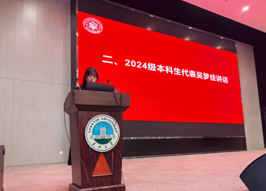 开学典礼在庄严的国歌声中缓缓展开。随后,2024级本科新生吴梦佳作为员工代表发言,她说,步入老员工活,就要快速调整心态,合理运用空闲时间,提升自我能力,明确前进目标,不忘初心,砥砺前行。
