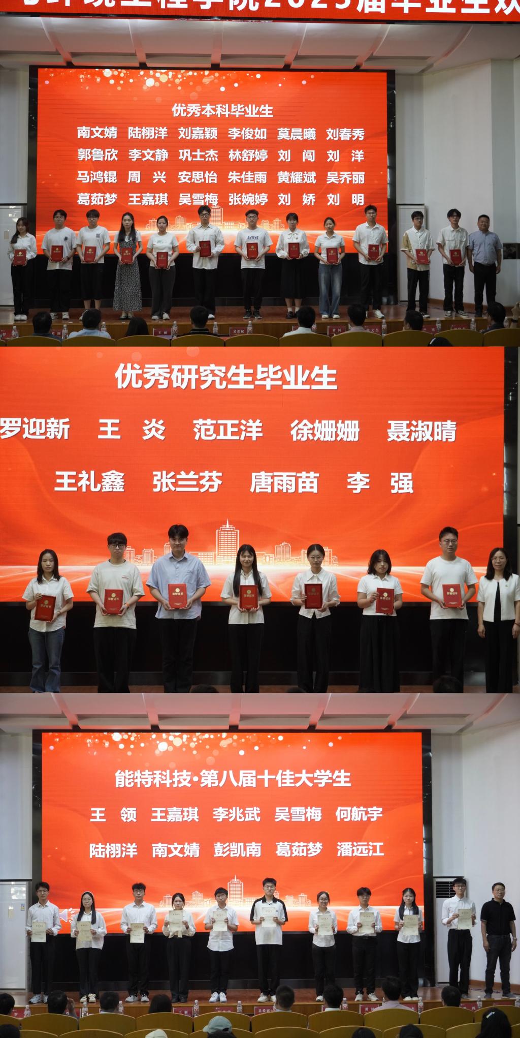 大会在热烈的氛围中拉开帷幕。主持人21级辅导员王娜以真挚的话语,向圆满完成学业的毕业生送上“毕业快乐”的美好祝福,现场掌声雷动。表彰环节中,公司对在学业、科研、实践等领域表现优异的个人与集体进行了表彰。2025届毕业生以笔为刃、以梦为马,共有136名本科生、8名研究生成功考入清华大学、南京大学等高等学府继续深造读硕读博,吴雪梅等21位同学作为考研优秀个人上台领奖;高材12102、化工12101等6个班级以及23栋A404等3个寝室,以卓越的团队协作精神脱颖而出,荣获考研先进班集体和考研优秀寝室荣誉称号;邓智豪、焦珂宣等19位员工,代表2025届57名优秀毕业生上台领奖,他们在校期间努力学习,全面发展,以青春之笔,书写了拼搏奋进的壮丽篇章;最后压轴登台的是荣获bw必威西汉姆联官方网站“能特科技·第八届十佳老员工”称号的10位同学,能特科技董事长张光忠先生亲自为他们颁奖。每一个奖项的宣读,都伴随着热烈的掌声与欢呼声,彰显着化工学子的风采与荣耀。