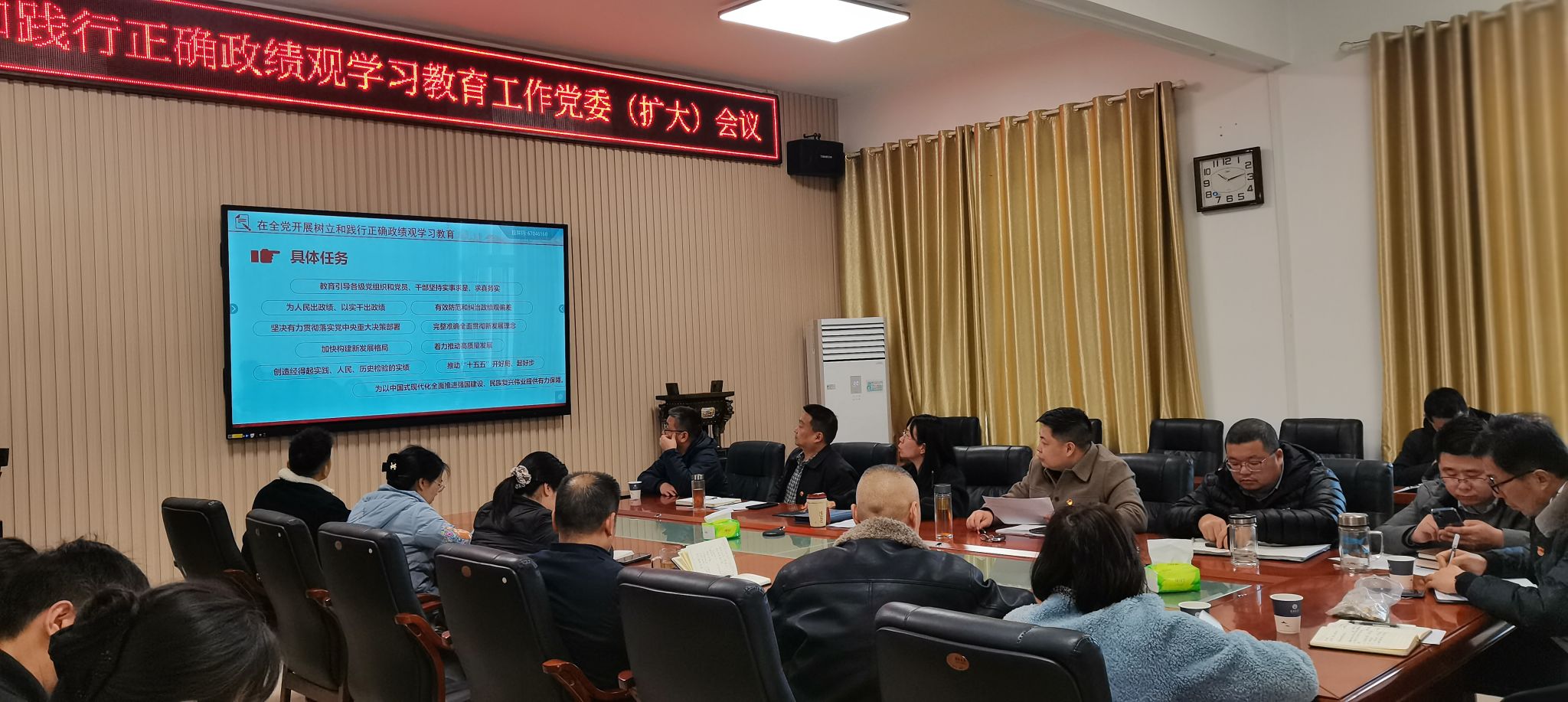 最后,王丽作总结讲话。她强调,树立和践行正确政绩观是每位党员干部的必修课,是一场持久战,全体党员干部要以此次学习教育为契机,在全面领悟“立党为公、为民造福、科学决策、真抓实干”16字的总要求的基础上,准确把握正确政绩观的丰富内涵,以正确政绩观“三问”为要求谋公司事业发展,要将学习成果转化为实际行动,实干担当共同把公司的事情做得更扎实、更有温度、更经得起师生和时间的检验,努力为公司“双一流”建设做贡献。
