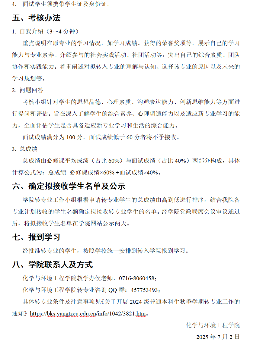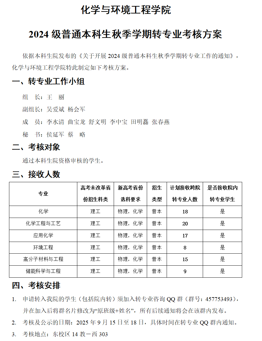 2024级普通本科生秋季学期转专业考核方案