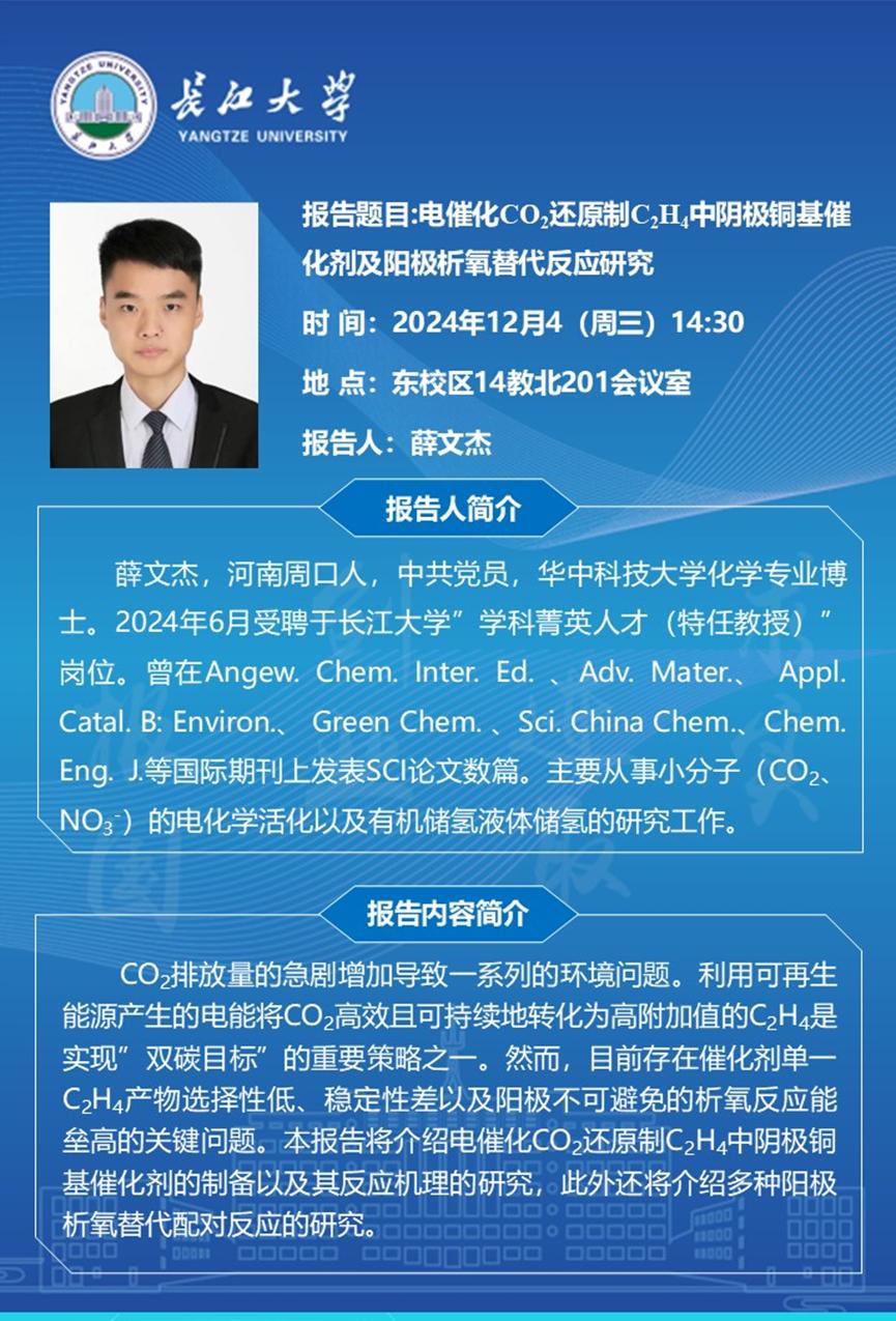 长江化工讲坛:电催化CO2还原制C2H4中阴极铜基催化剂及阳极析氧替代反应研究