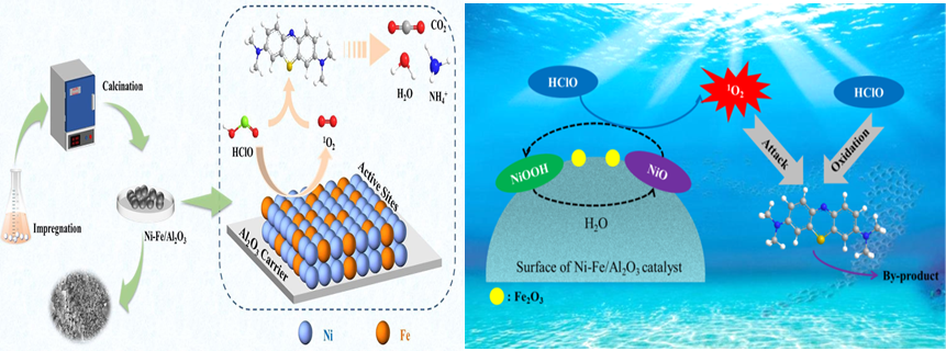 基于上述挑战,陈武教授课题组通过简单的浸渍热解法制备了负载氧化铝的Fe-Ni双金属催化剂(Ni-Fe/Al2O3),用于催化活化NaClO以去除MB。随后对Ni-Fe/Al2O3催化剂进行了各种表征。进一步研究了影响Ni-Fe/Al2O3/NaClO体系去除MB的几个关键参数。通过直接和间接自由基捕获实验对Ni-Fe/Al2O3/NaClO体系中的主要活性物种进行了评价。最后,使用密度泛函理论(DFT)和高效液相色谱-飞行时间质谱(LC-MS)鉴定的中间体提出了潜在的MB降解途径:主要通过HOCl的直接氧化和非自由基途径(1O2)进行;Ni3+/Ni2+氧化还原循环在HOCl活化产生活性物质中起着重要作用;MB降解的主要步骤是脱甲基、生色团裂解开环和矿化。为去除水中新出现的污染物提供了一种有效且创新的非均质AOP工艺。