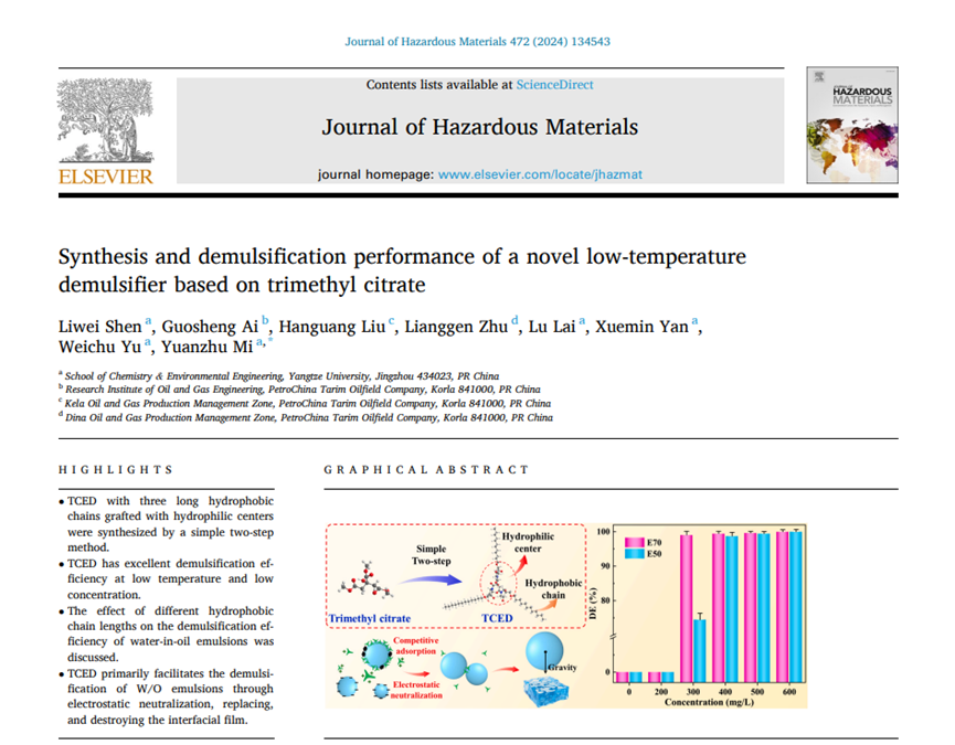 最近,《Journal of Hazardous Materials》(IF=13.6)发表了bw必威西汉姆联官方网站米远祝教授课题组的最新研究成果,报道了一种低温原油破乳剂的制备。论文题目为“Synthesis and demulsification performance of a novel low-temperature demulsifier based on trimethyl citrate”,硕士研究生申利伟为论文第一作者,米远祝教授为论文通讯作者。