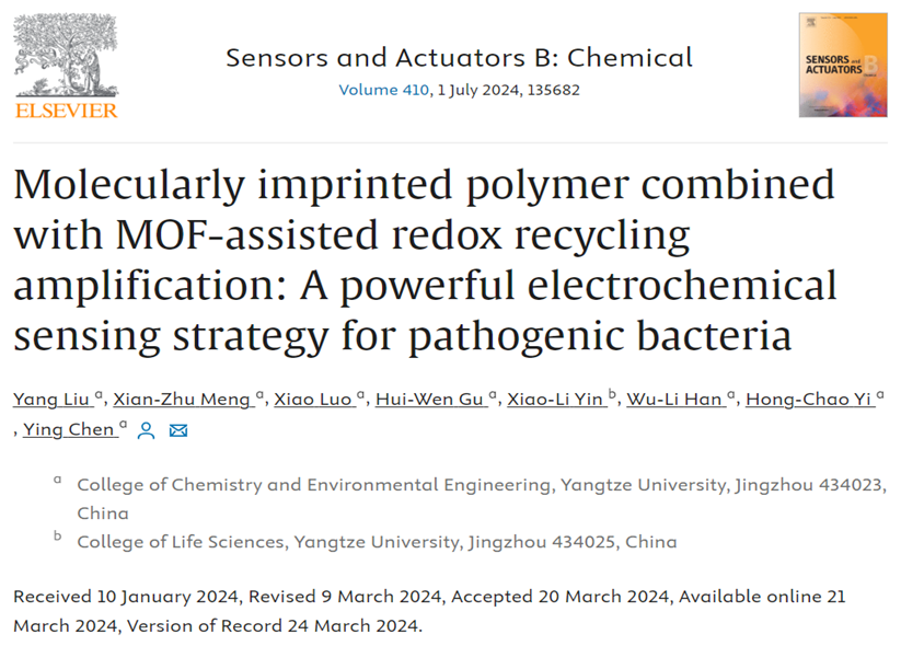 近日,bw必威西汉姆联官方网站陈颖教授课题组在食源性致病菌的检测方面取得重要研究进展,相关研究成果以题为“Molecularly imprinted polymer combined with MOF-assisted redox recycling amplification: A powerful electrochemical sensing strategy for pathogenic bacteria”的学术论文发表于分析化学领域国际著名期刊《Sensors and Actuators B: Chemical》(IF=8.4,中科院一区Top期刊)上。硕士研究生刘洋为论文第一作者,陈颖教授为论文通讯作者。该研究受国家自然科学基金(21605007)和湖北省自然科学基金(2023AFB906)项目的资助。