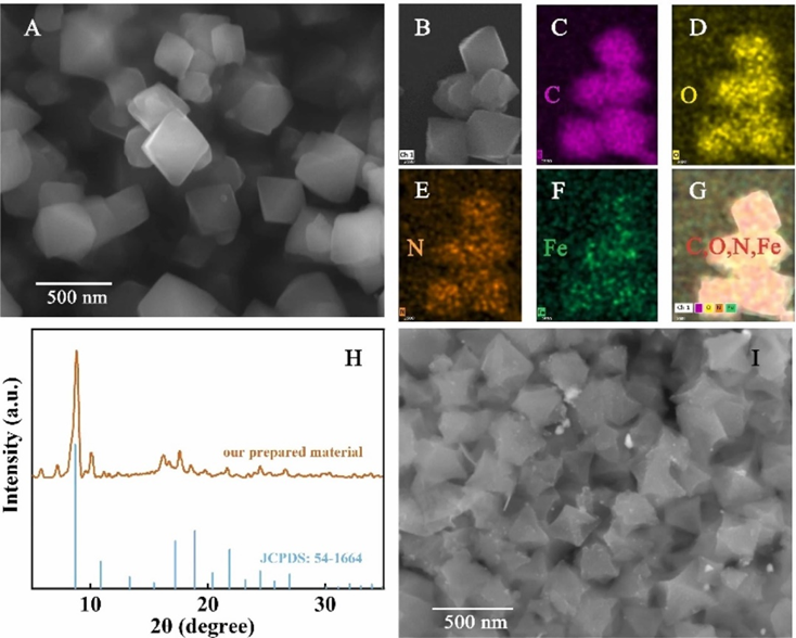 图2. Fe-MIL-88的SEM、EDS图像及XRD谱图