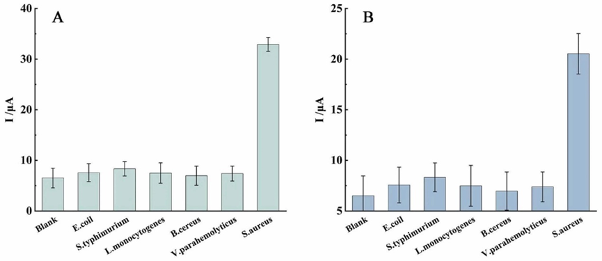 本研究构建了一种信号放大的夹心型电化员工物传感器,实现了S. aureus的快速、灵敏、选择性分析。该传感器将BIF选择性界面和MOF辅助氧化还原循环放大联用,具备低至1 CFU mL−1的检测限和良好的选择性,并可用于复杂样品检测。此外,通过替换不同的印迹模板和适体,本方法在检测其他细菌方面也展示出巨大潜力。总之,该方法具有出色的分析性能、高效快速操作及广泛适用性,在食品安全分析和细菌感染诊断领域具有广阔的应用前景。