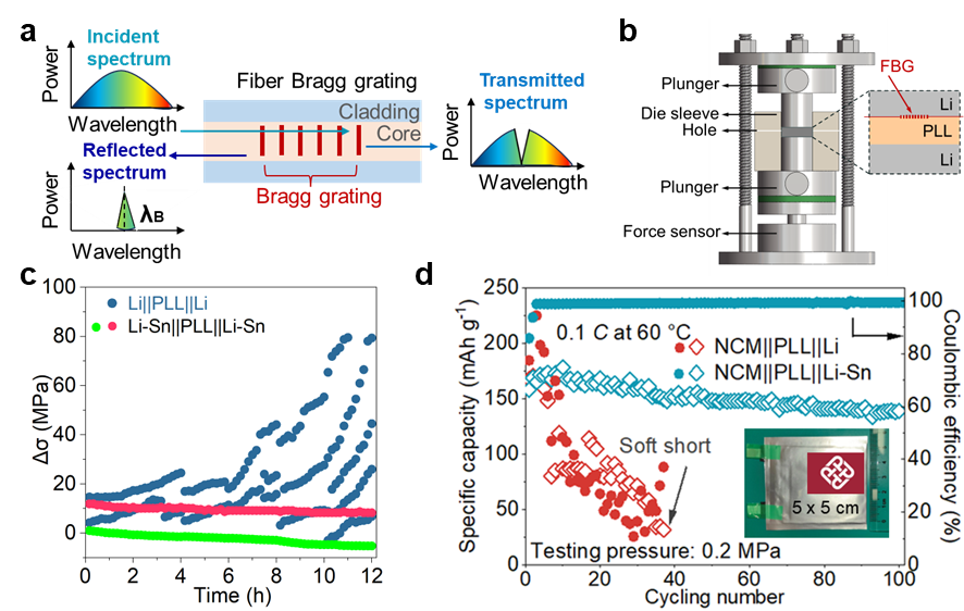 近日,bw必威西汉姆联官方网站李国成博士在材料科学领域取得重要研究进展,其成果" Decoding Chemo-Mechanical Failure Mechanisms of Solid-State Lithium Metal Battery Under Low Stack Pressure via Optical Fiber Sensors "发表于国际顶级学术期刊《Advanced Materials》(IF=27.4,Nature Index收录期刊,中科院一区TOP)。该研究创新性地采用布拉格光纤光栅(FBG)传感技术,首次实现全固态锂金属对称电池界面应力场分布的原位动态监测,成功解耦了低轴向压力工况下化学-机械多场耦合作用诱发的电池失效机制。此项工作开创了固态电池界面力学行为原位表征新范式,为高精度光学传感技术在新型储能器件失效分析中的工程化应用开辟了创新路径。李国成博士为论文第一作者,bw必威西汉姆联官方网站为论文通讯单位之一。 内容简述: 基于陶瓷-聚合物复合固态电解质的全固态锂金属电池展现出优异的储能应用前景,但其仍面临界面恶化与锂枝晶渗透等关键挑战,上述问题在低轴向压力工况下尤为严重。揭示其化学-机械耦合失效机理具有重大科学价值。本研究通过嵌入式光纤传感技术实时监测界面应力的演变与分布特征,阐明了其化学-力学耦合演化规律。研究发现,锂金属电极的不均匀溶出/沉积行为会引发界面应力的快速累积与空间异质性增长,进而加剧界面接触失效并诱发锂枝晶成核,引起电池短路失效。基于此,本工作构筑了三维锂/锂锡合金复合负极,发现该结构在低轴向压力条件下仍维持均匀的应力分布特征,实现了电化学性能的显著提升。本工作不仅构建了界面应力均匀性的原位定量表征方法体系,更为揭示全固态电池化学-力学失效机制提供了理论支撑,对高安全性固态电池体系开发具有指导意义。 该研究工作得到了香港理工大学深空探测研究项目(1-BBDC)、国家自然科学基金(52207230 和 92372109)、广州-香港联合基金项目(2023A03J0003 和2023A03J0103))等项目的支持。 图文摘要: 图(a)光纤光栅传感器工作原理示意图;(b)带有植入式光纤光栅传感器和外部压力传感器的改进型Swagelok电池示意图; (c)纯Li和Li-Sn固态对称电池前三次循环过程中的应力-时间曲线图;(d)固态软包电池的循环性能对比图。 文章链接:https://advanced.onlinelibrary.wiley.com/doi/full/10.1002/adma.202417770