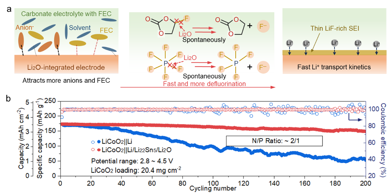 10月8日,bw必威西汉姆联官方网站肖围教授课题组在高性能锂金属电池领域取得重要研究进展,其成果"Li2O-Integrated Electrodes Enabling Enhanced Adsorption/Defluorination Kinetics toward LiF-Rich Interphase for High-Performance Lithium Metal Batteries"发表于国际顶级学术期刊Advanced Functional Materials。该研究创新性地通过电极设计,集成对碳酸酯电解液中含氟组分吸附/去氟化能力强的纳米氧化物,在金属锂电极表面原位构筑了化学/电化学稳定的含氟保护层,改善了锂金属负极的电化学性能。李国成博士为论文第一作者,肖围教授为论文第一通讯作者,bw必威西汉姆联官方网站为论文通讯第一单位。 内容简述: 锂金属负极因其极低的氧化还原电位和极高的理论比容量,被视为下一代高能量密度电池的理想选择。然而,其实际应用受限于较差的循环稳定性,主要归因于与碳酸酯电解液的高反应性。这种反应导致形成不稳定的固体电解质界面(SEI),在循环过程中易破裂,持续消耗活性锂和电解液。同时,天然SEI在组成、形貌和离子导率上的不均匀性会引发锂离子通量分布不均和成核位点杂乱,进而导致枝晶生长和电池短路。构建稳定均一的SEI层成为抑制副反应和枝晶问题的关键。研究发现,富含LiF等无机成分的SEI可有效提升界面稳定性。现有策略(如高浓度电解液、添加剂和表面修饰)主要通过调控电解液组成或界面化学来促进含氟物种分解生成LiF,但往往依赖复杂配方或精密工艺。相比之下,从电极设计入手,开发能高效吸附并促进含氟组分去氟化的新方法,为构建稳定富LiF界面提供了更具潜力的替代路径。 本研究提出了一种通过调控复合电极对含氟电解质组分的吸附与去氟化动力学,以定向构筑富LiF界面的新策略。采用机械化学方法,在Li/Li22Sn5复合电极中实现了Li2O纳米颗粒的原位、均匀嵌入。研究表明,Li2O对PF6⁻和氟代碳酸亚乙酯(FEC)具有强吸附能力,可加速其自发去氟化过程,进而引导形成以阴离子/FEC衍生物为主的富LiF 固体电解质界面。结合光谱学表征与理论计算,证实了Li22Sn5表面对含氟物种具有优先吸附与去氟化促进作用具有优先吸附与去氟化促进作用,揭示了该界面结构的形成机制。同时,稳定的Li22Sn5合金骨架有助于引导均匀锂沉积并缓冲体积变化,与Li2O协同增强电极稳定性。该复合负极在碳酸酯电解液中实现50次循环内平均库仑效率99.0%。与LiCoO2正极组装的完整电池在苛刻条件(N/P = 2:1,贫电解液20 μL)下表现出优异的循环稳定性,面容量为3.3 mAh cm⁻2,200周后容量保持率达87.0%;180 mAh软包电池在100次循环后仍保持78.2%的容量,充分证明了该电极设计策略的实际应用潜力。 该研究工作得到了国家自然科学基金(52272207和52274292)、北京自然科学基金(2192029)、湖北省杰出青年基金(2020CFA090)等项目的支持。 图文摘要: 图(a)Li/Li22Sn5/Li2O电极吸附/去氟化构筑富含LiF固态电解质界面层示意图;(b)LiCoO2||Li/Li22Sn5/Li2O、LiCoO2||Li电池循环性能对比图。 文章链接:https://advanced.onlinelibrary.wiley.com/doi/epdf/10.1002/adfm.202523194 (审核:肖围 编辑:常艳玲)