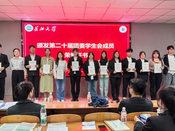 王陈老师和周学素老师为第二十届团委员工会成员颁发荣誉证书,兼职辅导员余海涛宣读第二十一届团委员工会全体成员任职名单。